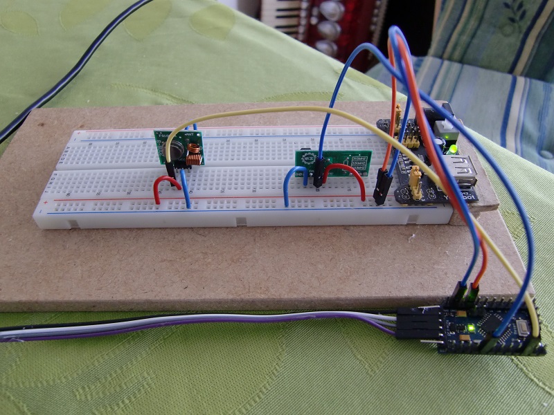 First I build an rd sniffer with the help of an arduino mini pro, a breadboard and a very cheap set of rf433 transmitter and receiver from ebay. The transmitter to pin 7 and the receiver to pin 2. look here for a picture. I imported the library rcSwitch in my arduino IDE and installed a programm from the examples in this library on the mini pro. Now I tried to sniff the code from my conrad remote control. It took quit some time before I noticed that I had to press the button quickly 3 times. Once this was clear I sniffed a code that had a decimal value and some other properties like protocol 2 and pulselenght 683. Now I can investigate if and how I can send this code.