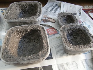 I filled the cured pots with water, this would help to get rid of some harmfull salts (like lime) from the hypertufa. The pot that i rubbed on the in en outside looks watertight, so this seems defenitly a way to seal the hypertufa. Hopefully this also applies to the single-sided rubbed pots.