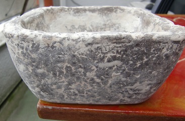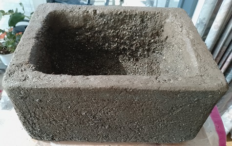 I lined the inside of the mold with plastic and modelled the trough with fairly thick walls. When unmolded after 24hrs, fibers can be seen all over the surface so it seems really well reinforced. With a knive i rounded the edges roughly and with a file i smoothed the top edge somewhat. I smeared the slurry from the filing over the worked surface, this will adhere and form a smooth skin. The sides are treated with a wirebrush to imitate the saw marks you often see on original troughs.