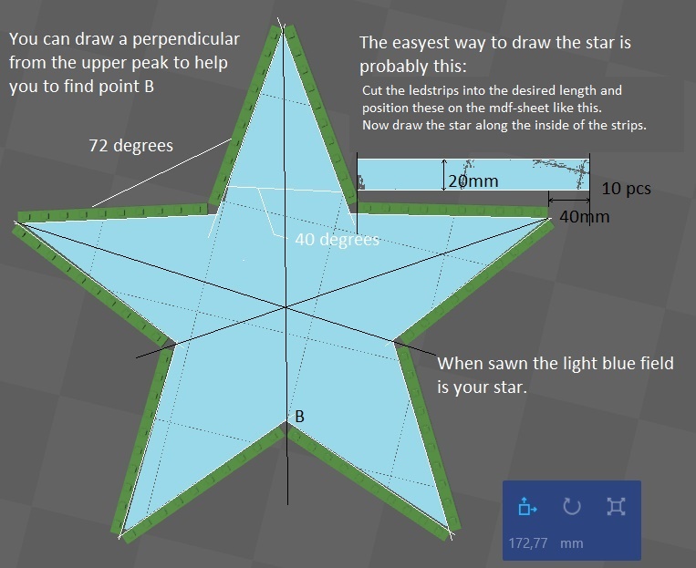 The general idea was to have a star with the led tops peeping out of the surface. The only way to accomplish this is to sink the strip in a gutter along the edges of the star. And then fill the gutter with pu resin so that only the leds are visible. I started with drawing the star. This is difficult enough without instruments. So i cut 10 strips of 1cm wide and the length of a 10 length ledstrip an layed this out on the mdf sheet. This way you can also decide on the most conveniant and advantageous way to saw the star. Now i could draw the star along the inside of the strips an saw it out of the sheet. We also need 10 mdf-strips of 20mm wide and 40mm longer than the led-strips. And for the sides another 10 strips of 25mm wide to be sure that the case will be deep enough to house the arduino. See the drawing below.