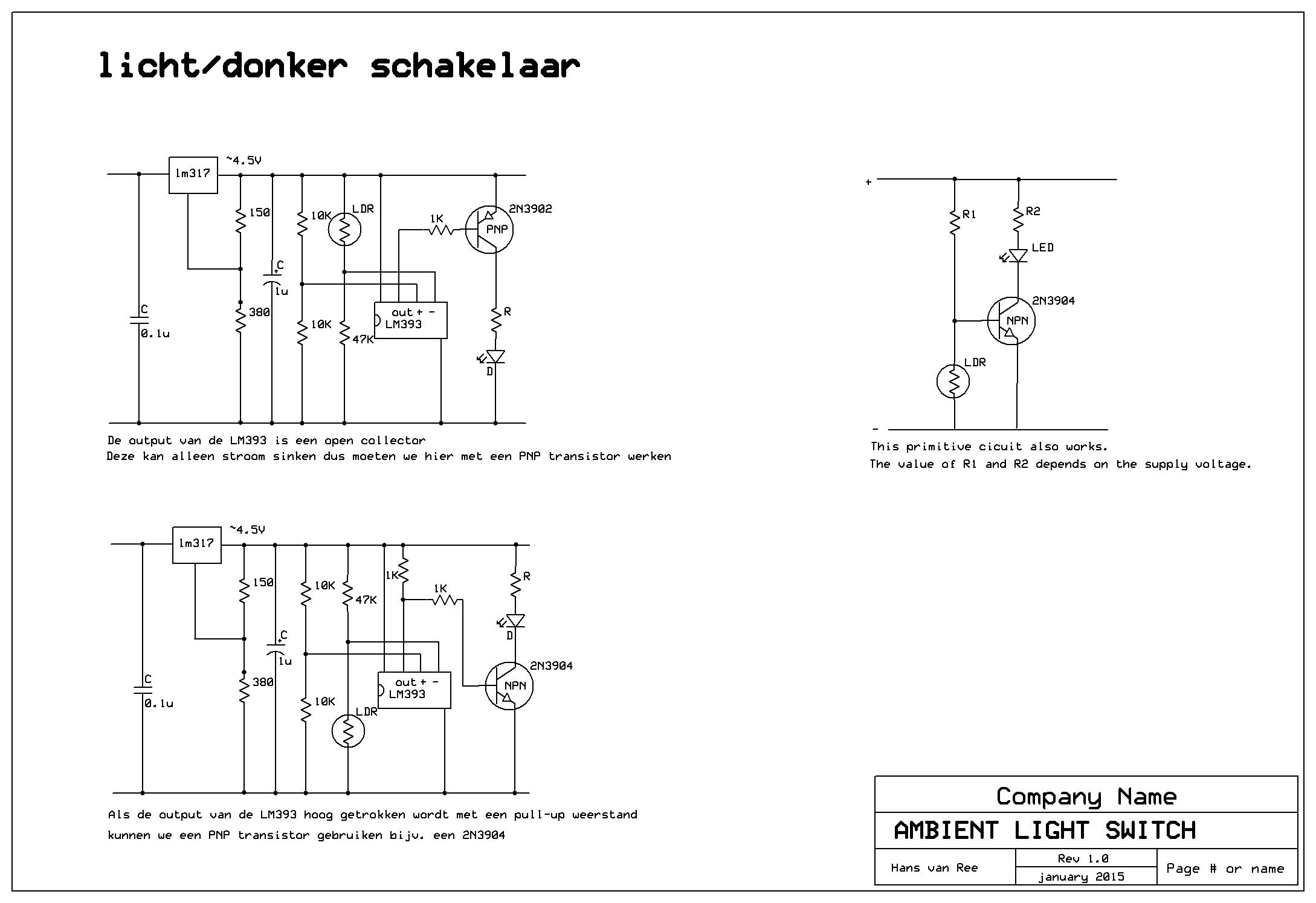 We kunnen de output echter ook hoog trekken met een pull-up weerstand. Als de LM393 geleidt dan is de out-pin laag en als hij niet geleidt dan is deze pin hoog. Nu kunnen we een PNP transistor toepassen. Dit keert de werking van de schakeling om dus moeten we de spanningsdeler met de LDR omdraaien, de LDR komt aan min