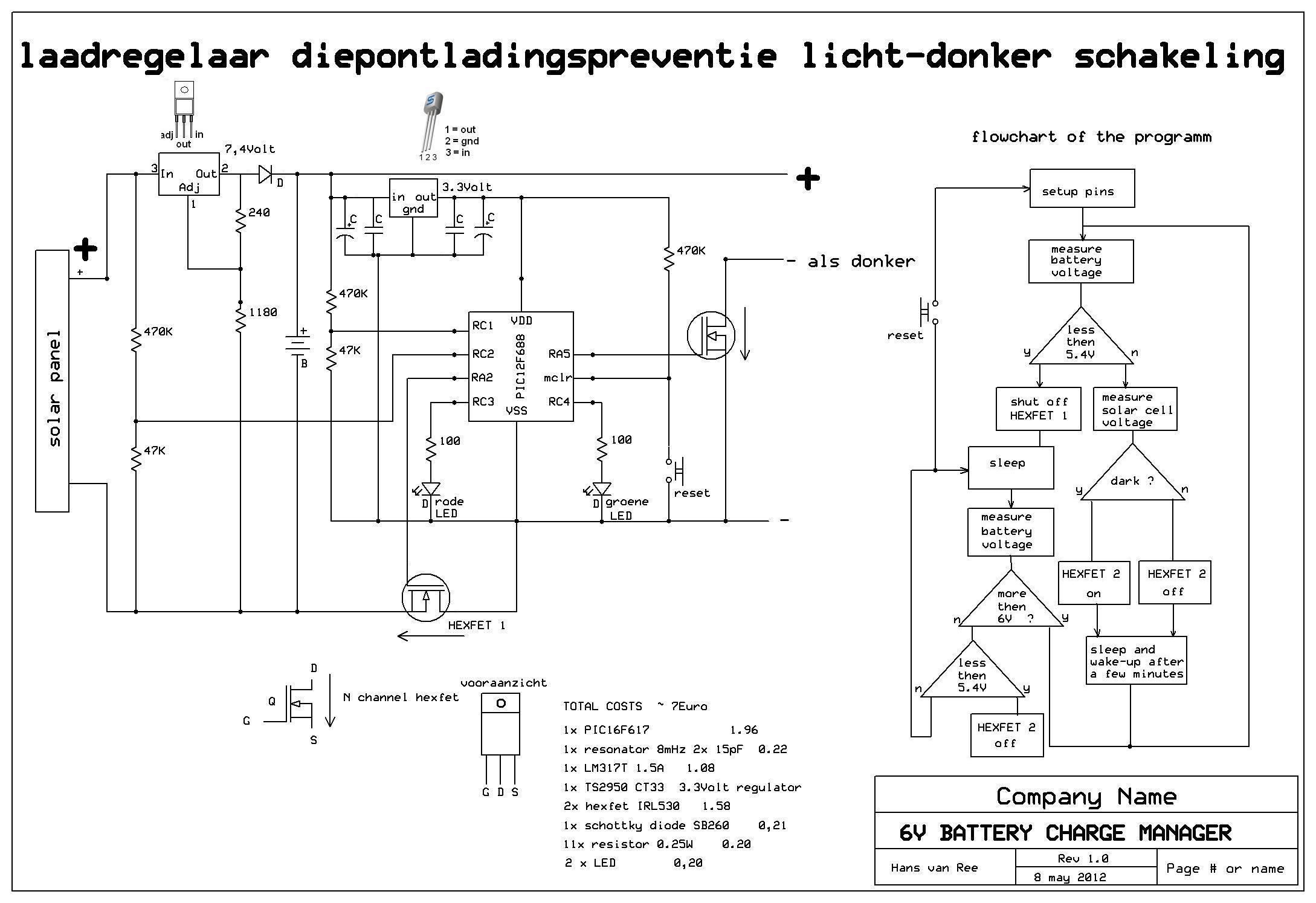 Dit is een 6 Volt laadmanager voor een loodgel accu. Deze moet laden met max. 7,4 volt en mag niet verder ontladen dan 5,4 volt.