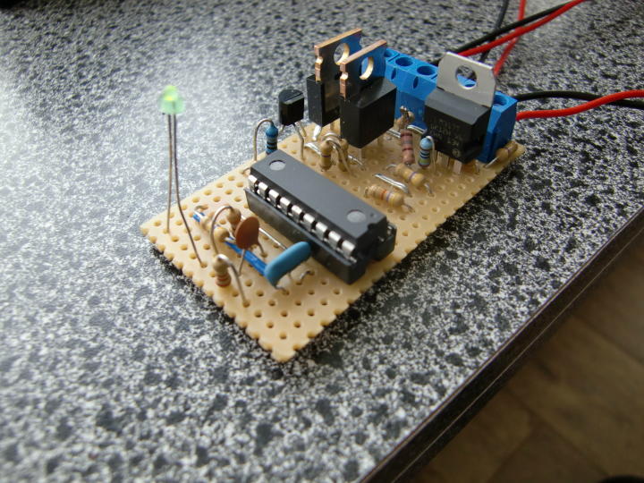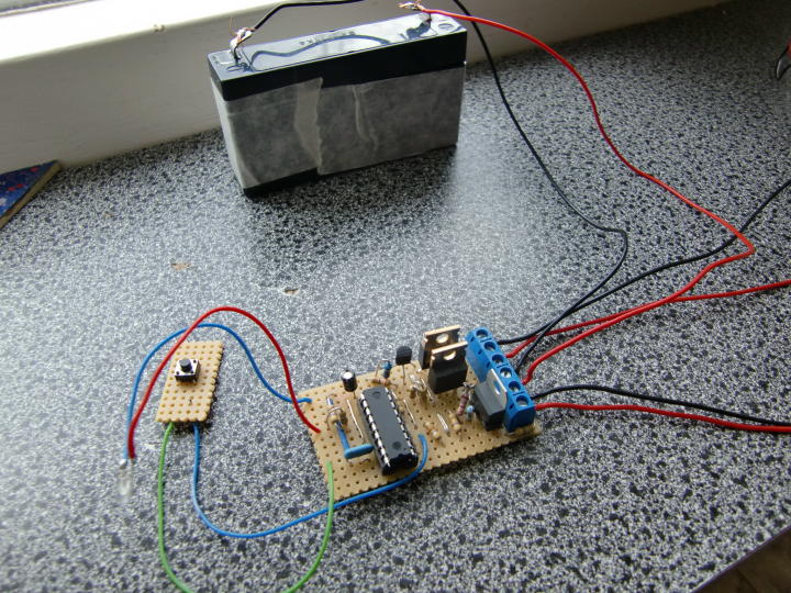 Een PIC16F688 processor meet van tijd tot tijd de spanning van de accu