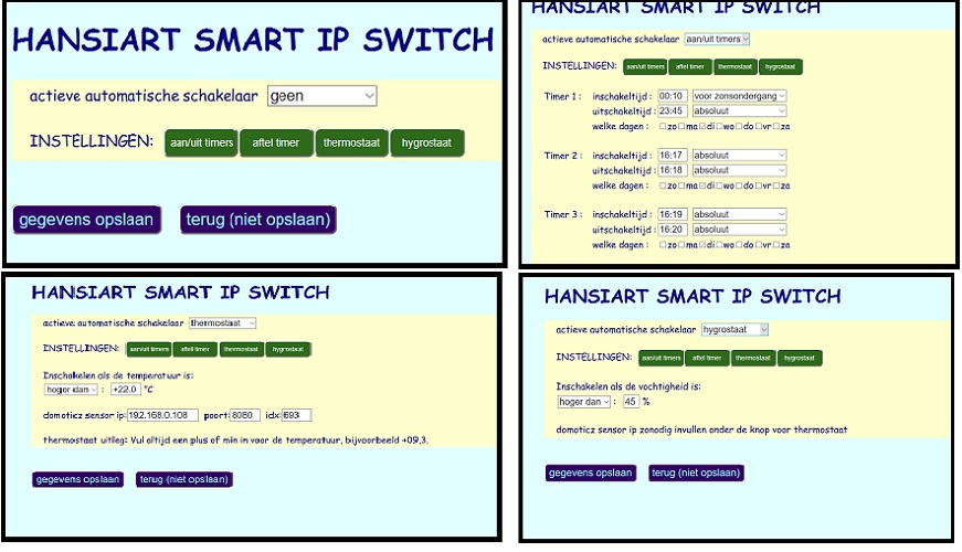 Klik in de webpagina op de knop 'timer config'. Er wordt nu een menu geopend met een select box en knoppen voor de beschikbare automatische schakelaars. Als je op een knop drukt, opent het scherm voor de desbetreffende instellingen. Druk nogmaals op dezelfde knop en het scherm sluit zich.