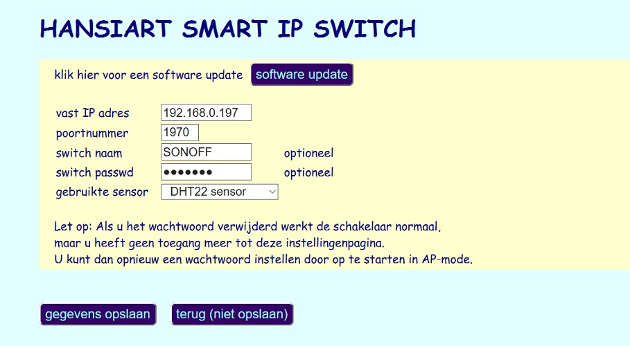 Let op: Als je de schakelaar van buiten je netwerk wil kunnen bedienen, stel dan een sterk wachtwoord in.!