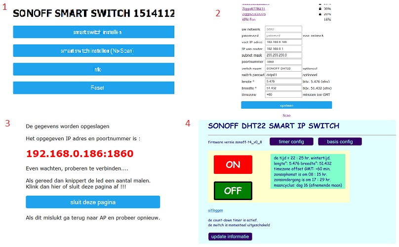 Eerst moet u gegevens achterhalen van uw wifi netwerk. Wat is het IP adres van uw router. Dit kunt u doen door te kijken naar het IP adres van uw pc of telefoon. Zoek dit op onder wifi instellingen. Als u bijvoorbeeld 192.168.0.12 als adres heeft dan is het adres van uw router 192.168.0.1. Noteer dit. Zoek ook de naam van je netwerk (SSID) en het wachtwoord op, zodat je dit bij de hand hebt. Via google kun je de breedte- en lengtegraad van je geografische positie bepalen. Dit is nodig voor een juiste berekening van de zonsopgang. De timezone is +60 minuten voor Europese tijd. Bedenk een wachtwoord voor de schakelaar als je deze wil beveiligen.