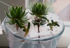 Another experiment: I covered a glass containing 2cm of water with foil. In the foil i poked holes through which i stabbed the stems of sempervivum rosettes, sedum species and delosperma. The stems do not reach the water but hang above it where they root easely in the moist air. Within a few days, even in winter.